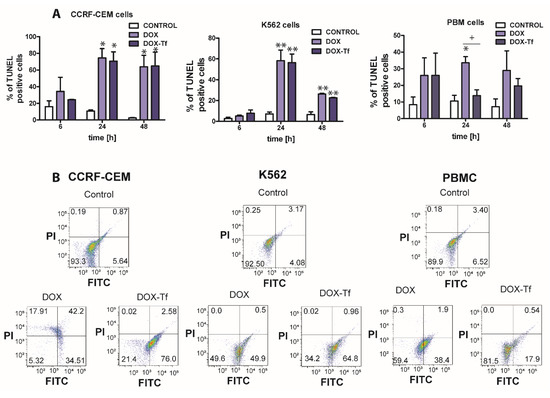 As shown in Figure 3A,B, the population of TUNEL-positive cells increased significantly when treated with free or conjugated DOX. The presence of DNA fragments with possible label-free 3’-OH ends was the highest in CCRF-CEM cells, and apoptosis increased from 20% to approximately 75% after 6 and 24 h of incubation with free or conjugated DOX. However, upon analysis of TUNEL-positive cells in the PBMC culture, it was revealed that DOX alone markedly increased the population of cells displaying DNA fragmentation, which is typical of apoptotic cell death.