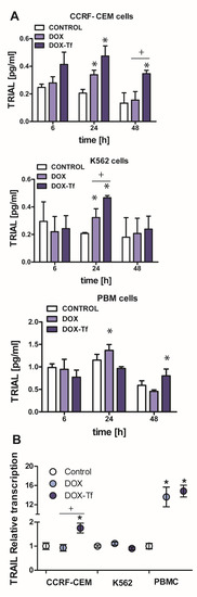 Based on our previous data that the conjugate causes a reduction of mitochondrial membrane potential, provokes cytochrome c leakage, and mediates the activation of caspase-3 [21,23] we next asked the question whether the extrinsic pathway of apoptosis is induced by DOX–Tf treatment in human leukemia cells. In addition to our previous findings, this hypothesis was developed based on caspase-8 activity measurements that revealed the possibility that the conjugate induced a TRIAL-dependent [21] mechanism of cell death. Indeed, an increase in TRAIL activity was observed in both leukemia cell lines after 24 and 48 h incubation with DOX or DOX–Tf. As shown in Figure 4A, we observed 2.6- and 1.4-fold higher TRAIL expression between samples incubated with the conjugate or with free DOX in CCRF-CEM and K562 cells, respectively. In contrast, the increase in TRAIL ligand (TRAIL-L) levels in normal PBMC cultures was induced only after 24 h continuous incubation with free DOX. To determine whether the effect of the conjugate on TRAIL ligand production was attributed to changes at the mRNA level, we decided to measure TRIAL–L gene transcript. Figure 4B shows that both forms of DOX stimulated TRAIL-L expression in PBMCs, which suggests a substantial influence of free drug and the conjugate to induce of the extrinsic apoptotic pathway in human leukemia cells. However, a statistically significant difference in TRAIL-L mRNA level was observed between DOX-treated and conjugate-treated samples only in CCRF-CEM cell lines, confirming a superior effect of the conjugate in acute leukemia cells.