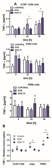 Changes in TNF-α expression in K562 and CCRF-CEM cell lines, and in PBMCs treated with transferrin-bound doxorubicin or free drug (A) The effect of IC50 concentrations of doxorubicin (DOX) and doxorubicin–transferrin (DOX–Tf) conjugate on TNF-α expression. The data represent mean ± SD of three independent experiments. * p < 0.05 in comparison to untreated, control cells, (+) statistically significant differences noted between the probes incubated with free DOX compared to the conjugate, + p < 0.05. (B) Expression of TNF-α gene transcript (relative to HPRT1 and HMBS housekeeping genes) in investigated human leukemia cell lines and PBMCs exposed to IC50 concentrations of DOX alone and DOX–Tf conjugate. Asterisks refer to the level of significance (* p < 0.05, n = 3) whereas symbol “+” indicates a difference between expression in the cells treated with DOX or DOX–Tf, + p < 0.05.