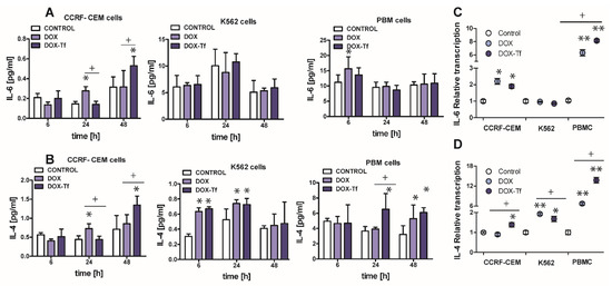 The evaluation of pro-inflammatory cytokines level after leukemia cells treatment with DOX and DOX–Tf conjugate. (A,B): The concentrations of interleukin 4 (IL-4) and interleukin 6 (IL-6) secreted in the supernatants of CCRF-CEM, K562, and PBMC cultures treated with IC50 concentrations of doxorubicin–transferrin (DOX–Tf) conjugate and DOX alone for 6, 24, or 48 h. The results show mean ± SD of three independent experiments. * p < 0.05,in comparison to untreated, control cells, (+) statistically significant differences observed between the probes incubated with free DOX in comparison to the conjugate, + p < 0.05. (C,D): Level of mRNA transcripts for IL-6 and IL-4 genes in CCRF-CEM, K562, and PBMCs exposed to IC50 concentrations of DOX–Tf conjugate and free doxorubicin for 48 h. Data (ΔΔCt values) were transformed into relative copy number values (the number of mRNA copies of the examined genes per housekeeping gene index, calculated as the average Ct value of the HPRT1 and HMBS housekeeping genes) and standardized to the level of mRNA transcripts in untreated cells, taken as 1. Results are presented as the means ± SD, (n = 6). Asterisks refer to the level of significant difference (* p < 0.05, ** p < 0.01) in mRNA level in the drug treated cells compared to untreated cells (control), whereas—symbol “+” (+ p < 0.05) refers to statistically significant differences between the cells incubated with DOX–Tf conjugate in comparison to the cells incubated with a reference drug (free DOX).