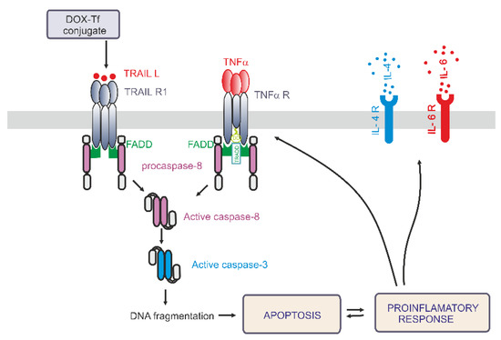 A simplified model of the differential effects of the doxorubicin–transferrin (DOX–Tf) conjugate on the pro-inflammatory response and induction of apoptosis via the extrinsic pathway. DOX–Tf conjugate stimulates the production of TNF-α and TRAIL ligand, the cell signaling proteins. They are also known as two major extrinsic mediators of apoptosis. Acute lymphoblastic cells and chronic myeloid malignancies have different isoreceptors for these cytokines. Binding of TRAIL or TNF-α to their receptors, results in death receptors aggregation (DR4, DR5) and Fas-associated death domain-containing protein (FADD). The death domain of FADD binds to an analogous domain of caspase-8 to form the death-inducing signaling complex (DISC). This process activates downstream caspases and leads to apoptosis. In parallel, in the presence of typical hallmarks of apoptosis, the DOX–Tf conjugate affects cellular genome and mediates the production of pro-inflammatory response. The transcription of IL-4 and IL-6 genes mediates the secretion of these cytokines to the extracellular matrix.