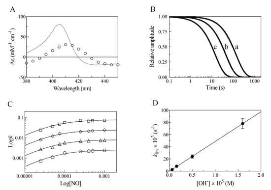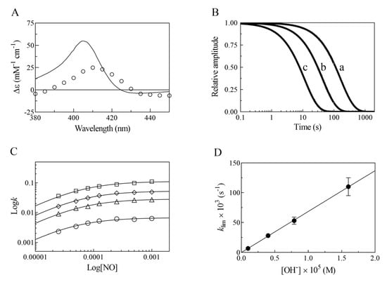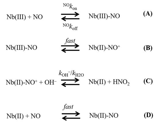 - The rate of the conversion of heme-Fe(II)-NO+ to heme-Fe(II) + HNO2 (Scheme 1C) represents the rate-limiting step of heme-protein reductive nitrosylation (present study and [22,23,24,25,26,27,28,30]). Of note, the OH– species catalyzes the conversion of Mt-Nb(II)-NO+ to Mt-Nb(II) + HNO2 and of Hs-Nb(II)-NO+ to Hs-Nb(II) + HNO2 much more efficiently than H2O (kH2O ~ 0 s−1). This may reflect either the higher affinity of negatively charged ligands for ferric heme-proteins with respect to uncharged compounds and/or the deprotonation rate of the incoming ligand [5,37,42].