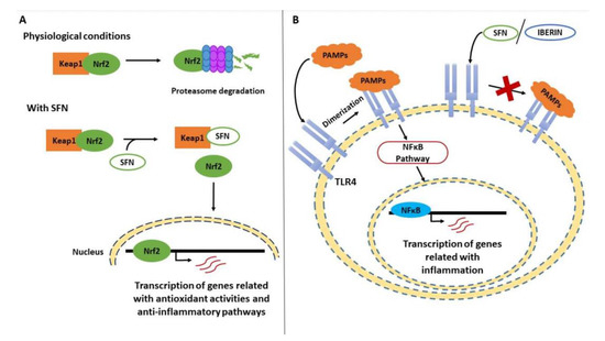 Effect of Brassicaceae bioactives compounds upon the transcription of genes related with inflammation. (A) In physiological conditions, Keap1 promotes the degradation of Nrf2 by the proteasome. However, when sulforaphane (SFN) interacts with Keap1 by binding its cysteine residues, Nef2 is released and translocated to the nucleus. In this way, Nrf2 up regulates the transcription of genes related with antioxidant activities and anti-inflammatory pathways. (B) In an inflammatory process, Toll-like receptor 4 (TLR4) undergoes dimerization after recognizing pathogen-associated molecular patterns (PAMPs), activating the NFκB pathway and up-regulating genes related with inflammation. When SFN and iberin interact with TLR4, it cannot oligomerizate, and the inflammatory response is inhibited.