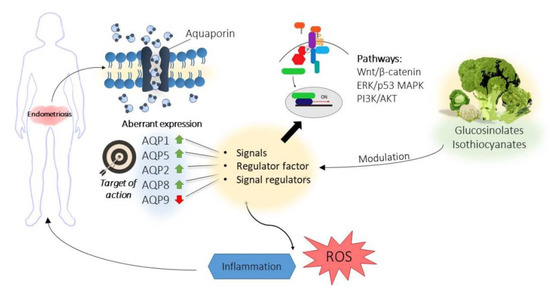 Role of aquaporins in endometriosis. Aquaporins are involved in different signaling pathways related with inflammation and endometriosis. Besides, aquaporins present an aberrant expression in endometrial tissues of women with endometriosis and therefore, they could be the target of therapies based on bioactive compounds derived from brassicas.