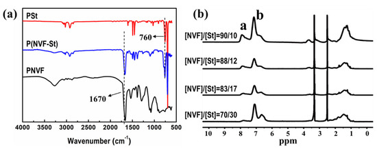 Fourier transform infrared spectroscopy (FTIR) and nuclear magnetic resonance spectroscopy (NMR) were conducted to reveal the structure and composition of the copolymerizing products. As shown in Figure 1a, the spectrum of copolymerizing product (P(NVF-St)) showed a strong C = O stretching at 1670 cm−1 and a phenyl ring C-H bending signal at 760 cm−1, which were contributed by NVF and styrene units, respectively [27,28,29]. In the 1H-NMR spectra of P(NVF-St) samples (Figure 1b), peak a at 7.5–8.1 and peak b at 6.4–7.3 ppm could be assigned to the protons (1H) of aldehyde group of NVF units and the aromatic protons (5H) of styrene units, respectively [19,30,31]. Thus, both IR and NMR spectra confirmed the formation of NVF-St copolymers.