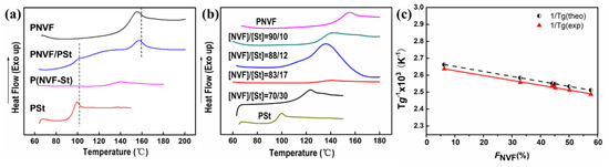 DSC curves of (a) PNVF/PSt blend (mass ratio 1/1) and (b) NVF-St copolymers. (c) The relationship between Tg and NVF unit content in NVF-St copolymers. Solid triangle dot: Tg obtained by DSC measurement; cycle dot: Tg calculated based on the composition using Fox equation.