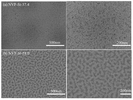 To further verify the microphase separation structure of the copolymer, transmission electron microscopy (TEM) was used. The copolymer samples were annealed at 120 °C for 3 h, and dyed by reaction of –NH-CHO groups in NVF units with RuO4. Figure 4 shows that as the FNVF increased, the area of the dark black zone became larger, indicating that the hydrophilic phase dominated by NVF increased. Moreover, when the FNVF increased from 37.4% to 58.0%, the copolymer underwent a phase transition and formed a microphase separation morphology. The NVF-St-58.0 exhibited obvious an microphase separation phenomenon between a hydrophilic phase dominated by NVF units (dark black) and a hydrophobic phase dominated by styrene units (light gray) due to the self-assembly behavior from two different kinds of incompatible segments in the copolymer. In the TEM images, the characteristic size of the microphase separation structure was about 40 nm, which was consistent with the results of AFM. It is worth mentioning that there were dense black spots at the hydrophilic phase and the hydrophilic/hydrophobic phase interface, indicating that the NVF side groups (-NH-CHO) in the copolymer could be exposed in water. Thus, the bicontinuous morphology may have facilitated the exposure and hydrolysis of NVF units to generate amine groups, which was essential for the preparation of amine-functionalized polystyrene. In addition, the good film-forming performance of the NVF-St copolymer allowed it to be possible to prepare the copolymer membrane, which could be converted into PSt-NH2 membrane by hydrolysis and further converted into AEM through quaternization.