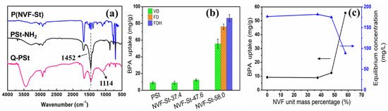 (a) FTIR spectra of P(NVF-St), PSt-NH2, and quaternized sample(Q-PSt). (b) Bisphenol A (BPA) uptake (mg/g) of NVF-St copolymers (VD: Vacuum-dried, FD: Freeze-dried, FDH: Hydrolyzed, dialyzed, and freeze-dried) and (c) the relationship between BPA uptake and NVF unit content in NVF-St copolymers (vacuum-dried). Adsorption condition: Copolymer 10 mg, BPA 200 mg/L, 5 mL, pH 7, 18 h, room temperature.