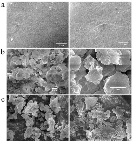 Scanning electron microscopy (SEM) and Brunaner–Emmett–Teller (BET) analysis were used to observe the formation of holes. SEM images (Figure 6) and the significant increase in specific surface area (Table S1) also demonstrated the formation of through-holes, which was related to the hydrophilic–hydrophobic bicontinuous morphology. According to Figure 6a,b, the sample (No.6) prepared under vacuum-dried had smooth and continuous surface morphology, while after freeze-drying, the morphology became porous and rough. Therefore, the specific surface area (Table S1) of the latter (80.5 m2/g) was much larger than that of the former (3.5 m2/g). The specific surface area directly affected the adsorption performance. In future study, the pore morphology and specific surface area of the NVF-St copolymer may be further well controlled by adjusting the conditions such as the freezing rate. Most importantly, the bicontinuous morphology facilitated the exposure and hydrolysis of NVF units to generate amine groups (Figure 5a). After hydrolysis, the sample (No.6) showed the highest BPA uptake (as high as 86 mg/g and about 8.5 times larger than that of PSt, Figure 5b). The hydrolyzed product not only had a porous structure (Figure 6c), but also provided an additional positive charge to interact with the phenol group in BPA. Additionally, the increase of the BPA equilibrium concentration could further improve the BPA uptake of the sample. When the equilibrium concentration was increased to 0.5 mmol/L, the BPA uptake of the hydrolyzed product reaches 226 mg/g. Compared with commonly used activated carbon and polymer adsorbents (Table 2), NVF-St copolymer had higher adsorption capacity and could be prepared in a facile way by free radical copolymerization. Therefore, the strategy of free-radical copolymerization of NVF with styrene may be used to obtain PSt-NH2 in a simple way. In short, the resultant PSt-NH2 was a desirable precursor for making AER and AEM, because it had adjustable water uptake, obvious microphase separation structure, and green and facile preparation process.