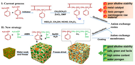 Anion exchange resins (AER) and anion exchange membranes (AEM) have always attracted much attention and are widely used in many fields, such as water treatment [1,2], medicine purification [3], microbial or anion exchange membrane fuel cell [4,5,6,7,8], and catalysis. For many decades, benzyltrimethylammonium, which is easily synthesized by quaternization of the chloromethyl-functionalized polystyrene, has been the most commonly used cation in polystyrene-based AEM and AER (Scheme 1I) [7,9]. However, this structural motif is not stable enough in alkaline media and can be degraded through β-elimination reaction at the benzyl position [7,10]. In addition, the chloromethylation of polystyrene or styrene involves highly toxic and carcinogenic raw materials (e.g., chloromethyl ether and dichloromethyl ether), which are not environmentally friendly, and has caused many safety concerns [11,12,13]. In addition, AER and AEM made by this method remain with a number of inherent shortcomings, including poor adjustability of amino-moiety, self-crosslinking side reaction, potential metal catalyst pollution, and usage of toxic and highly inflammable porogens such as toluene, xylene, dichloroethane, and aliphatic hydrocarbons (Scheme 1I) [12,13,14]. Therefore, it is necessary to develop a safe and green procedure to make AER and AEM.