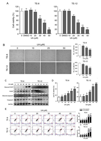 To evaluate the effect of UA on the viability of ESCC cells, we performed an MTT cell viability assay. TE-8 and TE-12 cells were treated with various concentrations of UA (0–50 µM) for 48 h. The IC50 of TE-8 was 39.01 µM, and the IC50 of TE-12 was 29.65 µM. The MTT assay results showed that UA significantly decreased the ESCC viability in a dose-dependent manner (Figure 1A). The cell viability data show that UA induced more than 50% cell death at a concentration of 30 µM in TE-12 cells and 40 µM in TE-8 cells. In soft agar colony formation assay, the number and size of colonies were reduced in a dose-dependent manner after UA treatment, indicating the anti-proliferative property of UA against growth of TE-8 and TE-12 cells (Figure 1B). To examine whether UA causes apoptosis in esophageal cancer cells, we measured the protein levels of cleaved-caspase-3, caspase-3, cleaved-poly [ADP-ribose] polymerase (PARP), and PARP in TE-8 and TE-12 cells. As shown in Figure 1C, UA suppressed PARP and caspase-3 protein levels and increased the protein levels of the cleaved form of PARP and cleaved-caspase-3 in TE-8 and TE-12 cells. To further confirm the induction of apoptosis by UA in esophageal cancer cells, we performed a flow cytometry analysis. Annexin V staining results showed that both the early stage of apoptotic cells and the late stage of apoptotic cells were increased after UA treatment in a dose-dependent manner in the TE-8 and TE-12 cells (Figure 1D). Moreover, sub-G1 phase cells are considered as apoptosis cells, whose number we calculated using a cell cycle analysis. UA significantly induced sub-G1 phase cells in a dose-dependent manner in esophageal cancer cells (TE-8 and TE-12 cells) (Figure 1E). These results indicate that UA induced caspase-dependent cell death in ESCC cells.
