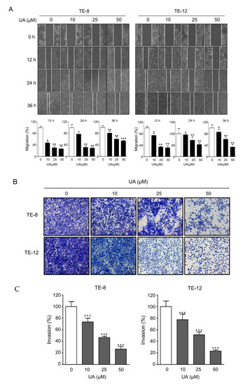 Migration and invasion are the initial and critical events in metastasis [44]. To evaluate the migratory capacity of TE-8 and TE-12 cells under the influence of UA, we conducted a wound healing assay. The scratch was made using a 200 µL pipette tip on a monolayer culture of the TE-8 and TE-12 cells. The migratory capacity of the TE-8 and TE-12 cells treated with UA was remarkably decreased in a dose-dependent manner. The wound treated with 50 µM of UA healed more slowly than the wound treated with 0, 10, and 25 µM of UA (Figure 2A,B). We further investigated the invasion ability of the TE-8 and TE-12 cells after UA treatment. As shown in Figure 2C, the Matrigel invasion assay demonstrated significantly decreased invasion effects after UA in the TE-8 and TE-12 cells in a dose-dependent manner. The results suggest that UA inhibits the migration and invasion of ESCC cells.