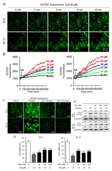 ROS are related to the formation of autophagosomes, and UA induces ROS production in human glioma cells [47]. To further investigate whether autophagy induction by UA is due to ROS production in ESCC cells, we measured the dichlorofluorescein diacetate (DCFDA) fluorescence after UA treatment. The confocal fluorescence microscopy image showed that the TE-8 and TE-12 cells treated with UA (30 µM) resulted in increased intracellular DCFDA fluorescence in a time-dependent manner (Figure 5A). These data indicate that ROS production was increased by UA treatment in a time-dependent manner in the ESCC cells. As shown in Figure 5B, the DCFDA fluorescence was increased after UA treatment in a dose-dependent manner in the TE-8 and TE-12 cells. The induced DCFDA fluorescence after UA treatment was inhibited in the presence of 100 nM of diphenyleneiodonium (DPI) (a ROS production inhibitor) and 1 mM of N-acetyl-cysteine (NAC; an ROS production inhibitor) in the TE-8 and TE-12 cells (Figure 5C). We further assessed cell proliferation and LC3 protein levels after DPI and UA treatment in the TE-8 and TE-12 cells. As shown in Figure 5D, the decreased cell viability after UA (30 µM) treatment was recovered by the DPI treatment in a dose-dependent manner in both the TE-8 and TE-12 cells. In addition, the increased LC3-II protein levels by UA were also inhibited after DPI treatment in a dose-dependent manner in the TE-8 cells; however, these protein levels were only inhibited by a high dose of DPI (200) µM in the TE-12 cells (Figure 5E). Taken together, these data indicate that UA might be responsible for the autophagy of ESCC by increasing ROS levels.