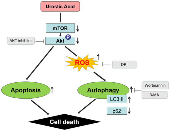 Various anticancer agents have been demonstrated to effectively induce cell death by regulating ROS generation [65]. Shen et al. demonstrated that UA induces autophagy through ROS-mediated endoplasmic reticulum stress [47]. Consistent with these studies, we demonstrated that ROS levels were increased by UA treatment in a dose- and time-dependent manner in TE-8 and TE-12 cells. In addition, ROS production and LC3-II protein levels induced by UA treatment were both inhibited by the ROS inhibitor DPI. Decreased cell viability by UA treatment was also reversed by DPI treatment in the TE-8 and TE-12 cells, suggesting that UA inhibited the growth of ESCC cells by inducing ROS-dependent autophagy, thereby making UA a promising agent for treating ESCC. However, we need to study which ROS subtype is mediated by UA to induce autophagy via Akt-mTOR cell death in ESCC cells. In conclusion, our data indicate that UA induced autophagy by enhancing ROS production via the Akt signaling pathway, a process that ultimately induced cell death in the ESCC cells (Figure 6). These findings suggest that UA is a promising clinical chemotherapeutic agent for treating ESCC.
