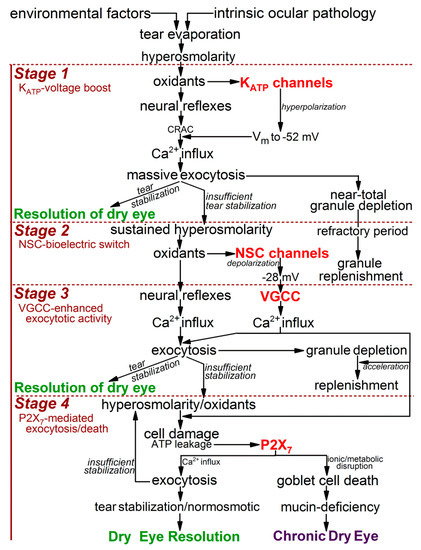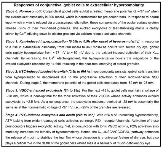 Based on our analysis of ion channel activity and exocytotic function in goblet cells located in freshly excised rat conjunctiva [9,10], we now identify four stages in the adaptive response of these cells to the sustained elevation in the extracellular osmolarity to 360 mosM (Figure 1), which is associated with highly symptomatic dry eye [1]. During the first stage, oxidant-activated KATP channels rapidly generate a ~15-mV voltage that increases the membrane potential from ~−37 to ~−52 mV. In turn, this hyperpolarization markedly boosts the magnitude of the exocytotic response to cholinergic input and result in the near-total emptying of mucin-filled granules. In our experimental preparation of freshly excised rat conjunctiva, the ~30-min of KATP-induced hyperpolarization is followed by stage 2, in which the goblet cells fundamentally switch their bioelectric profile from hyperpolarized to depolarized. This bioelectric switch is mediated over a ~6 h period of continued hyperosmolarity as the progressive activation of oxidant-sensitive depolarizing NSC channels steadily lowers the membrane potential. After ~6 h in stage 2, the goblet cell voltage is −28 mV, which is subsequently maintained throughout the 18 h of stage 3. A key functional impact of the NSC-induced depolarization is that, at −28 mV, the voltage is optimal for the tonic activation of the goblet cell VGCCs whose opening enhances evoked exocytosis [10]. Stage 4 commences when hyperosmolarity persists for >6 h. A highlight of this final stage is activation of purinergic P2X7 receptor/channels by ATP released from osmotically damaged cells. With the activation of these purinoceptors, exocytotic activity is triggered, but over time, P2X7 activation, in conjunction with VGCC activity, renders the goblet cells highly vulnerable to the lethality of hyperosmotic-induced oxidants. Hence, our experimental findings indicate that the goblet cells of the conjunctiva respond to unremitting hyperosmolarity by eventually adopting a high-risk adaptive strategy. The KATP/NSC/VGCC/P2X7 pathway not only boosts the release of tear-stabilizing mucin, but if a return to normosmolarity does not occur, then this pathway profoundly compromises the viability of the conjunctival goblet cells whose loss is a hallmark of chronic mucin-deficient dry eye.