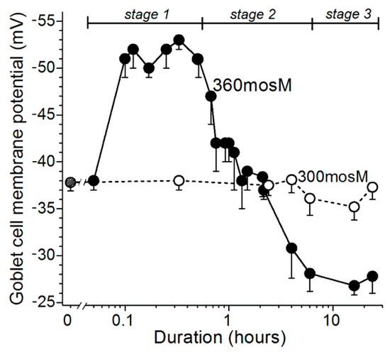 Membrane potentials of goblet cells located in excised conjunctival specimens maintained in a normosmotic 300-mosM solution or a hyperosmotic 360-solution. Data are from recent electrophysiological studies [9,10]; vertical bars show standard errors. During stage 1, goblet cells rapidly hyperpolarize from ~−37 to ~−52 mV (p ≤ 0.0001). After ~30 min, the goblet cells begin a ~6-h depolarization that terminates as their membrane reaches −28 mV, which is significantly lower (p < 0.0001) than the voltages in stage 1 or under normosmotic conditions (stage 0). Throughout the 18 h of stage 3, goblet cells maintain their membrane potential at ~−28 mV.