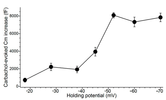 In these experiments, a perforated-patch pipette sealed onto a goblet cell was used to measure the membrane capacitance (Cm), which is a quantitative indicator of exocytosis. In addition, current passed via the recording pipette maintained the sampled goblet cell at a predetermined holding potential. During these recordings, exocytosis was evoked by supplementing the perfusate with the cholinergic agonist, carbachol (10 µM). As summarized in Figure 3, the carbachol-evoked Cm increase was maximal at voltages of ~−50 mV or more negative. Consistent with previous calculations indicting that cholinergic-evoked exocytosis at −52 mV results in the near-total release of stored granules [9], the carbachol-evoked Cm increases measured in goblet cells maintained at holding potentials of −60 and −70 mV were not significantly larger than the increase observed at −52 mV. Thus, even though the Ca2+ electro-gradient was increased, the releasable pool was maxed out at −52 mV. We concluded that the KATP-induced hyperpolarization to −52 mV during stage 1 optimally positions the goblet cell voltage for the maximum release of tear-stabilizing mucin. Hence, a previously unappreciated feature of conjunctival goblet cells is their expression of a sufficient number of KATP channels to drive their membrane potential to −52 mV and thereby to maximize the exocytotic release of tear-stabilizing mucin.