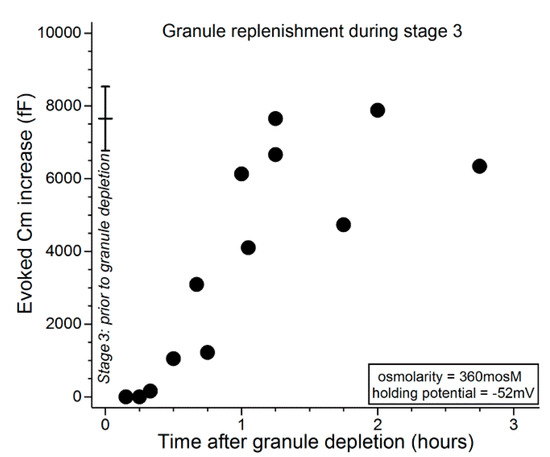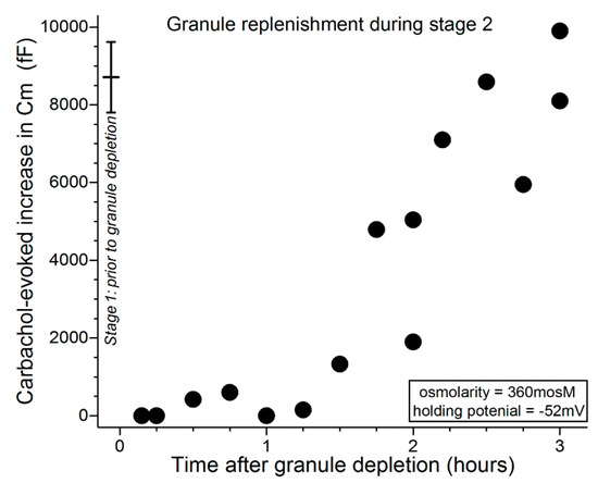 Figure 5 shows that during the initial ~30 min after administration of the depletion protocol, carbachol exposure evoked minimal, if any, increase in Cm. In experiments in which the interval between depletion and subsequent exposure to carbachol was lengthened, Cm increases were evoked and over time approached a level reflective of near-complete replenishment of releasable granules (Figure 5). Consistent with VGCCs playing a role during stage 3, comparison of the data in Figure 5 with those in Figure 4 indicates that granule replenishment is more rapid during stage 3, when the VGCCs are tonically activated. Namely, the Cm increases evoked 1 to 2 h after granule depletion were 6190 ± 620 fF (n = 6; holding potential = −52 mV) and 2200 ± 910 fF (n = 6; p = 0.0047) in stages 3 (after depletion earlier in stage 3) and 2 (after depletion in stage 1), respectively.