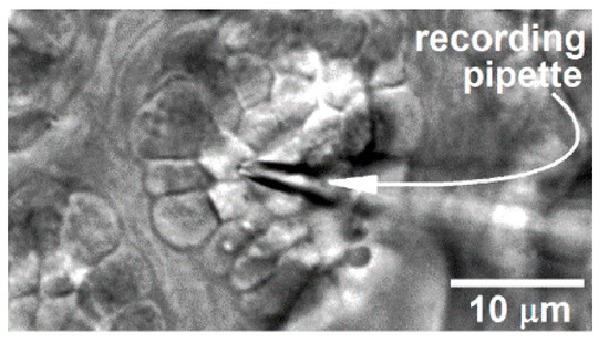 As described previously [9,10], a specimen-containing chamber was positioned onto the stage of an upright microscope and viewed at 400X with differential interference contrast/infra-red optics. The recording chamber could be perfused at ~2 mL/min with either the 300-mosM solution described above or a 360-mosM solution that included the non-NaCl components of the 300-mosM solution plus an appropriate concentration of NaCl to achieve 360 mosM, which was confirmed by vapor pressure osmometry (Vapro 5600). Care was taken to obtain electrophysiological recordings from multi-cellular clusters in which all of the goblet cell were viable. Hence, as detailed previously [10], each conjunctival specimen was exposed for precisely 15 min to the 300-mosM supplemented with 0.04% trypan blue, whose presence within a cell is indicative of death. After the specimen was washed 3 times, it was examined with bright-field optics at X100 magnification in order to assess goblet cell positivity for trypan blue. Locations of goblet cell complexes containing exclusively trypan blue-negative cells were documented using the locale’s x–y coordinates on the microscope stage, as well as a sketch and/or a digital image of the location within the specimen. Using 5 to 10 MΩ pipettes (TW150F-4, World Precision Instruments, Sarasota, FL, USA) filled with a solution consisting of 50 mM KCl, 65 mM K2SO4, 6 mM MgCl2, 10 mM K+-Hepes, 60 μg·mL−1 amphotericin B, and 60 μg·mL−1 nystatin at pH 7.35 and 280 mosM, perforated-patch recordings were obtained from the apical surface of cells located in a goblet cell cluster, which is a well-characterized and easily identified feature of the rat conjunctiva ([22,27]; Figure 7).