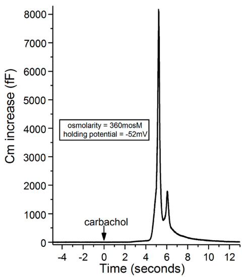 Recordings with access resistances of <25 MΩ and <10% variability were made via an EPC-9 (HEKA Elekronik, Lambrecht, Germany) patch-clamp amplifier, which used Patchmaster software (HEKA) to control data sampling and acquisition. Data analysis was also aided by graphics software (Origin 2018, OriginLab Corp, Northampton, MA, USA). Adjustment was made off-line for the junction potential, which was −8 mV for the solutions used in this study. Evoked exocytosis was quantified by monitoring the membrane capacitance (Cm) of single goblet cells, as described in earlier studies [9,10] and illustrated in Figure 8. Although a Cm increase reflects net exocytotic and endocytotic activities, the increase in Cm detected soon after exposure to an agonist chiefly reflects the initially evoked exocytosis preceding the onset of endocytotic activity [28]. Cm measurements were obtained by using the “sine + DC” method [29] in which a 30-mV peak sinusoidal signal was applied at a frequency 1.8 kHz to a voltage-clamp recording obtained via a perforated-patch pipette, which also was used to inject current that maintained the voltage of the sampled goblet cell at a pre-selected holding potential. With Patchmaster software (HEKA) emulating a lock-in amplifier, the resulting current response was used to calculate Cm [30]. Recordings with spontaneous fluctuations of ≥100 fF were excluded.