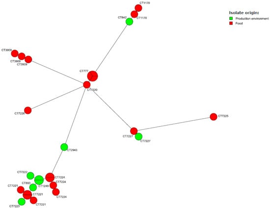 MST of cgMLST allelic profiles of 28 L. monocytogenes studied strains. cgMLST types (CTs) are represented by colored circles where size is proportional to the number of isolates.