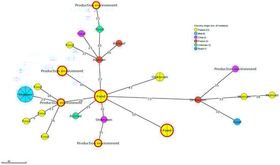 MST based on the cgMLST profiles of 13 L. monocytogenes strains studied belonging to SL121 together with 26 SL121 strain profiles publicly available at BIGSdb-Lm (listed in Table S2). cgMLST are represented by colored circles where size is proportional to the number of isolates. Numbers on the branches show alleles differences between neighboring nodes. Circles with red rim represent L. monocytogenes strains from the present study.