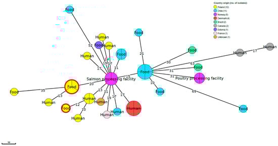 L. monocytogenes sequence type ST8 has also been previously described as a persistent variant [,]. Such strains were also isolated during a cross-border outbreak of listeriosis caused by cold-smoked salmon in Denmark and France and were of cgMLST type CT771 []. During the present study, four L. monocytogenes ST8 isolates belonging to CT777 (three strains) and CT7220 (one strain) were identified, but none were closely related to the strains previously isolated from humans, whose sequences are available in the BIGSdb-Lm database. Furthermore, the L. monocytogenes ST8 currently recovered from fish were genetically different than those described in the EFSA and ECDC ROA document on the multi-country listeriosis outbreak during 2014–2019 linked to the consumption of cold-smoked fish products []. It has been previously shown that L. monocytogenes ST8 strains had a strong ability to persist in food processing plants, including smoked fish production environments [,,]. Furthermore, such isolates were also transferred between different food enterprises through raw food materials []. This may result in the persistence of certain L. monocytogenes clones in environmental niches for a long time and their transmission between food facilities [,]. Finally, this may interfere with the interpretation of data from WGS analyses performed during outbreak investigations [,].