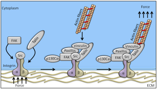 - Bell, S.; Terentjev, E.M. Focal Adhesion Kinase: The Reversible Molecular Mechanosensor. Biophys. J. 2017, 112, 2439–2450. [Google Scholar] [CrossRef]