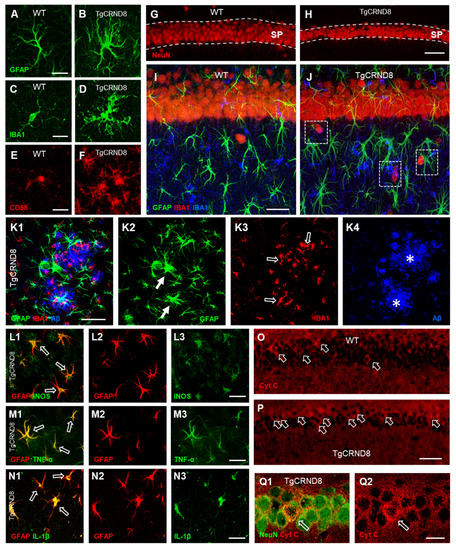 (A,B) Representative confocal photomicrographs of GFAP immunostaining of an astrocyte (green) in CA1 SR of a WT (A) and a TgCRND8 mouse (B). Scale bar: 15 µm. (C,D): representative confocal photomicrographs of IBA1 immunostaining of microglia (green) in CA1 of a WT (C) and a TgCRND8 mouse (D). Scale bar: 20 µm. (E,F): Representative confocal photomicrographs of CD68 immunostaining of reactive microglia (red) in CA1 SR of a WT (E) and a TgCRND8 mouse (F). Scale bar: 20 µm. (G,H) Representative confocal photomicrographs of NeuN immunostaining of neurons (red) in CA1 SP of a WT (G) and a TgCRND8 mouse (H). Scale bar: 60 µm. (I,J) Representative confocal photomicrographs of triple immunostaining of neurons (NeuN, red), astrocytes (GFAP, green), and microglia (IBA1, blue) in the CA1 SR of a WT (I) and of TgCRND8 mouse (J). Neuron–astrocyte–microglia triads are evidenced in (J) (framed areas). Scale bar: 40 µm. (K1–K4): representative confocal photomicrographs of triple immunostaining of astrocytes ((K2), green, white arrows), microglia ((K3), red, open arrows), and amyloid beta (Aβ) plaques ((K4), blue, asterisks) in CA1 SR of a 6 months old TgCRND8 mouse. The merge is shown in panel (K1). Scale bar: 50 µm. (L1–L3) Double staining immunohistochemistry with anti iNOS ((L3), green) and anti GFAP ((L2), red) antibodies in CA1 SR of a TgCRND8 mouse. iNOS is colocalized in astrocytes ((L1), open arrows). Scale bar: 25 µm. (M1–M3) Double staining immunohistochemistry with anti TNF-α ((M3), green) and anti GFAP ((M2), red) antibodies in CA1 SR of a TgCRND8 mouse. TNF-α was colocalized in astrocytes ((M1), open arrows). Scale bar: 25 µm. (N1–N3) Double staining immunohistochemistry with anti IL-1β ((N3), green) and anti GFAP ((N2), red) antibodies in CA1 SR of a TgCRND8 mouse. IL-1β is colocalized in astrocytes ((N1), open arrows). Scale bar: 25 µm. (O,P): representative photomicrographs of Cyt C immunostaining of apoptotic neurons ((O,P) red) in CA1 SP of WT and a TgCRND8 mouse. The open arrows point to apoptotic neurons in CA1 SP. Scale bar: 100 µm. (Q1,Q2) Confocal magnification of Cyt C positive apoptotic neurons ((Q2), red, open arrow) in CA1 SP of a TgCRND8 mouse. Scale bar: 30 µm. (Modified from [37]).
