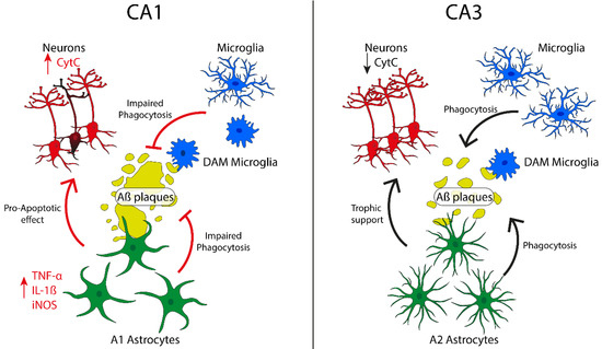 Microglia can be seen also neuroprotective or neurotoxic depending also on the crosstalk with astrocytes. Indeed, the concomitant presence in CA1 of A1-type reactive astrocytes, which lose their ability to phagocytose damaged neurons [138] can start a vicious cycle in which microglia that has lost its scavenging activity is no longer able to dispose of the amyloid fibrils that add up making plaques bigger and bigger and less disposable. This is in line with recent evidence that demonstrates subregional-specific patterns of neurodegeneration at different stages of Aβ deposition [263,264].