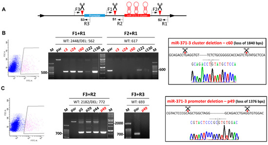 4.2. Establishment of the CRISPR/Cas9 System Targeting Deletion of the miR-371/372/373 Cluster and the miR-371/372/373 Promoter