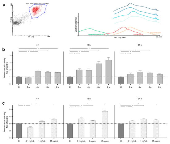 (a) For FACS analysis, the decisive cell population was defined and gated, as shown in the left panel. As pictured by the circled gate R1, the further studied cell population was selected by forward (FS) and side scatter (SS), which indicate size and granulation of the particles (left panel). In addition to the mechanically stimulated groups, the analysis of 3 defined control groups (negative control—undyed; unstimulated control; and positive control—pharmacologically induced autophagy) were carried out. Fluorescence peaks are shown along the x-axis to visualize the amount of fluorescence in the FL1 log FITC channel. The more to the right the peaks are positioned on the x-axis, the more fluorescence was measured in the FITC channel. On the y-axis, the percentages of the maximum fluorescence events are shown (right panel). (b) Effects on autophagosome accumulation, indicated by fluorescence, after 4, 16 or 24 h of treatment with 2, 4, 6 or 8 g/cm2 or no pressure. Autophagic flux was interrupted by chloroquine treatment. (c) Effects on autophagosome accumulation, indicated by fluorescence, after 4, 16 or 24 h of treatment with 0.1, 1.0 or 10 ng/mL IL-1β or no treatment. Autophagic flux was interrupted by chloroquine treatment. Fluorescence intensity is shown as fold of control. Mean ± SEM (n = 12 replicates); * significant (p < 0.05) difference between groups.
