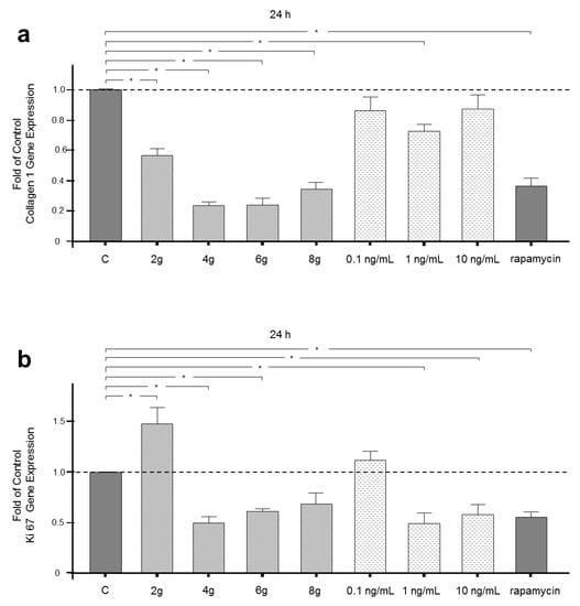 Activation of mTOR controls protein synthesis. Therefore, gene expression of collagen 1, which is the most important component of extracellular matrix produced by PDL fibroblasts, was assessed after 24 h of stimulation. Collagen 1 gene expression was significantly reduced by inhibition of mTOR following rapamycin treatment. Moreover, all magnitudes of mechanical pressure decreased gene expression of collagen 1 significantly. A reduction of more than 75% was found in the 4 and 6 g/cm2 group. Inflammatory stimulation with an intermediate concentration of IL-1β also led to a reduction in the gene expression of collagen 1 by more than 50%. Low and high concentrations of IL-1β treatment, however, did not have a significant influence on collagen 1 gene expression (Figure 2a).