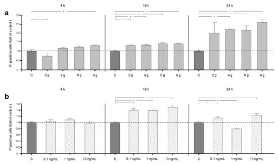 Interestingly, an application of 2 g/cm2 for 4 h significantly reduced cell death by over 20% and consequently had a cell-protective effect. The same amount of pressure significantly increased PI-positive cells after 16 h. Interestingly, 24 h of treatment with 2 g/cm2 did not change the number of PI-positive cells significantly in comparison to controls. After 4 h of pressure application, only high pressure treatment of 8 g/cm2 induced cell death by over 20% significantly, whereas 4 and 6 g/cm2 had no significant effect on the number of dead cells. However, after 16 and 24 h of pressure with 4, 6 and 8 g/cm2 increased the number of dead cells significantly—more than 2-fold increases (Figure 3a).