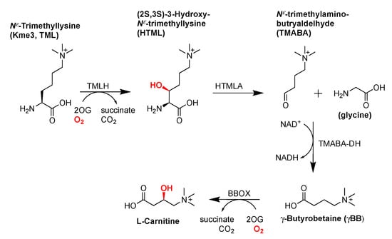 Free Kme3 is involved in the carnitine biosynthesis pathway, where it acts as the first intermediate in a series of four enzymatic reactions to generate L-carnitine (Figure 2) [31]. The first step of the pathway is stereospecific C-3 hydroxylation of Kme3 to 3-hydroxy-Kme3 (HTML) by Nε-trimethyllysine hydroxylase (TMLH), which is the only step that takes place in the mitochondria. HTML is then transported to the cytosol and cleaved into glycine and 4-N-trimethylaminobutyraldehyde (TMABA) by HTML aldolase (HTMLA), after which it is oxidized to 4-N-trimethylaminobutyrate (γ-butyrobetaine) by TMABA dehydrogenase (TMABA-DH). In the final step, γ-butyrobetaine is hydroxylated by BBOX to the final product (3R)-3-hydroxy-4-N-trimethylaminobutyrate, better known as carnitine [31].