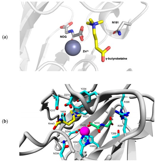 (a) Ribbon representations of BBOX (grey) in complex with γ-butyrobetaine (yellow) and NOG (N-oxalylglycine, inactive 2OG analogue). Key active site residues are labeled and zinc ions are depicted as spheres (PDB-ID: 3O2G) [36]. (b) The computational homology model for Nε-trimethyllysine hydroxylase (TMLH), based on the crystal structure of BBOX in the presence of zinc (pink), NOG (green), and Kme3 (yellow). (Reprinted (adapted) with permission from Biochem. J. (2019) 476 (7): 1109–1119. Copyright 2020 Portland Press.).