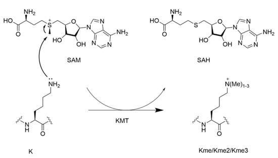 Lys methylation is highly distinct from other histone PTMs as it is the smallest known modification and also maintains the ɛ-amine’s formal positive charge. The ɛ-amino group of lysine can be methylated up to three times—monomethyllysine (Kme), dimethyllysine (Kme2), and trimethyllysine (Kme3)—by S-adenosylmethionine (SAM)-dependent histone lysine methyltransferases (KMTs). The best studied family of KMTs is the suppressor of variegation, enhancer of zeste and trithorax (SET) domains family, which was originally characterized in Drosophila [17]. SET family enzymes, also classified as epigenetic “writers”, were shown to state- and site-specifically catalyze the methylation of lysine residues on histones and other proteins [18]. Non-SET domain-containing proteins, such as DOT1L, have been found to methylate Lys residues [19]. The human genome is predicted to have about 100 KMTs [20]. Each additional methylation alters the size and hydrophobicity of the side chain, which makes it possible for biological effectors to distinguish between the various methylation states.