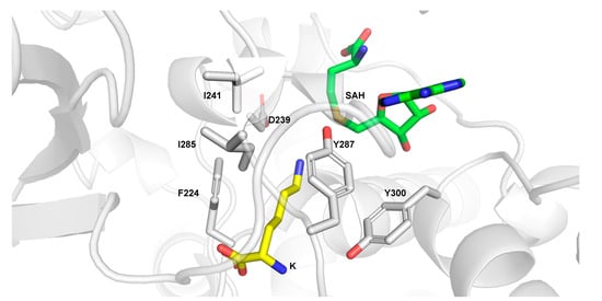 Methylation takes place upon a conformational change in a hybrid ping-pong-like mechanism, in which the methylation intermediate stays bound to RLSMT, while SAM and SAH bind and release, respectively, multiple times [51,52]. Both K and Kme are substrates of LSMT, even though their kcats are significantly lower compared to the natural substrate Rubisco, while Kme2 is neither a substrate nor an inhibitor of LSMT [54]. The crystal structures of RLSMT bound to SAH and K (Figure 6) or Kme reveal that the aliphatic K side chain interacts with Phe224, Ile285, Tyr287, and Tyr300 by hydrophobic interactions. Furthermore, binding of K takes place via a hydrogen bonding with a water molecule that is stabilized by hydrogen bonding with Asp239 and Ile241. The crystal structures reveal that Kme is shifted about 1 Å compared to K, which might be due to the bulky methyl group attached. As a result, water-mediated hydrogen bonds with Asp239 and Ile241 cannot be formed, but instead a new hydrogen bond between the terminal amine of Kme and an arginine residue is formed. Interestingly, the methyl group is not surrounded by any hydrophobic residues, but instead is coordinated by carbon–oxygen hydrogen bonds in a cage containing hydroxyl and carbonyl functionalities in close proximity. In both cases, the distances between SAH and the substrates are appropriate for nucleophilic attack, as well as the angles between SAH and K and SAH (157°) and Kme (166°). These angles are optimal for an SN2 attack, but result in different kcat of 6.2 × 10−5 s−1 for K and 2.5 × 10−4 s−1 for Kme [54].