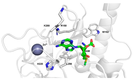 Histone lysine methyltransferases are mostly specific towards one methylation state. Trimethylation of K is catalyzed by the SET domain-containing proteins, the SUV39 family, the MLL family, and the non-SET methyltransferase DOT1L [55,56,57]. SUV39H2 catalyzes di- and trimethylation of H3K9, and it is structurally very similar to G9a and GLP, which catalyze mono-, di-, and trimethylation on the same K [58]. Binding of SAM by SUV39H2 is stabilized by several hydrogen bonds with amino acids located in close proximity to SAM in the binding groove (Figure 7). Furthermore, cation–π interactions with Arg150 and hydrophobic interactions with L298 contribute to the binding stability of SAM.