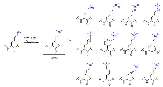 Another possibility to incorporate Kme3 mimics into proteins in the presence of KMTs is to change the cosubstrate SAM instead of the substrate peptide [77,78,79] (Figure 9). It was shown that KMTs display some promiscuity when it comes to the SAM cosubstrate structure, and through synthesizing SAM-analogues, different functional groups can be attached on lysine. An example of this is using a propargyl-functionalized SAM analogue that can be synthesized in one step from SAH [80]. This compound was used to perform CuAAC-based click reactions for labeling and profiling genome-wide methylation [81]. The repertoire of available SAM analogues was expanded by inclusion of other alkyne-functionalized groups to allow for further fine-tuning of reactivity [82]. As with the propargyl variant of SAM, the other reactive group of the classic click reaction was also successfully incorporated by KMTs, and azido-SAM could be used as a probe for genome-wide profiling of methylation as well [83].