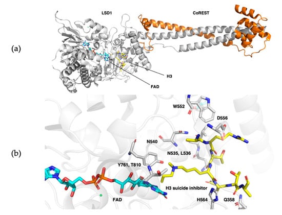 (a) Ribbon representation of lysine-specific demethylase 1 (LSD1)–co-repressor of RE1-silencing transcription factor (CoREST) in complex with a flavin adenine dinucleotide (FAD)-H3 suicide inhibitor (PDB-ID: 2UXN). LSD1 (grey), CoREST (orange), FAD (cyan), H3 suicide inhibitor (yellow), Cl- ions (green). (b) Key residues of the LSD1-H3-binding domain in complex with a FAD-H3 suicide inhibitor for LSD1 (grey). FAD (cyan), H3 suicide inhibitor (yellow) [103].