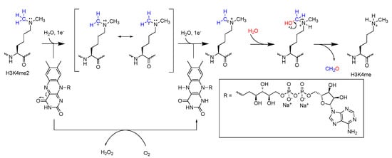 Mechanistic representation of flavin adenine dinucleotide (FAD)-dependent demethylation of dimethylated L-lysine residues by LSD1 and LSD2. LSD-catalyzed demethylation starts with flavin-mediated two-electron oxidation of methylated lysine, forming an imine intermediate upon reduction of the flavin cofactor. Subsequent hydration forms the N,O-hemiacetal, which results in collapse of the intermediate and formation of formaldehyde and demethylated substrate. FAD can be re-oxidized by molecular oxygen, releasing hydrogen peroxide from the catalytic cleft. This oxidation resets the active site back to its original state, ready to catalyze another demethylation [92].