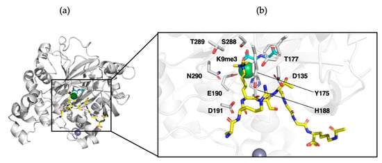 (a) Ribbon representation of JMJD2A (grey) in complex with H3K9me3 (yellow), Ni(II) (dark gray), Zn(II) (green), and NOG (cyan) in stick representation. (b) A zoomed view on the JMJD2A H3 binding site. All key JMJD2A residues are labeled [110].