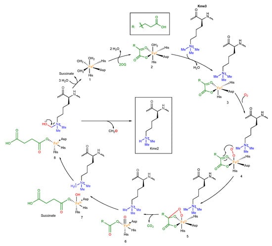 Substrate recognition by JHDMs is often mediated by additional reader domains (function, structure, and mode of recognition discussed in a separate chapter) [111]. The catalytic consensus mechanism for the JHDMs is proposed to have an eight-step catalytic cycle (Figure 13). 2OG enters its binding pocket (1) and coordinates to the Fe(II) (2). It is suggested that formation of the Fe(II)– 2OG–substrate complex (3) leads to weakening of Fe(II)–water coordination, opening a coordination site for O2 and subsequent formation of a Fe(III)–superoxide intermediate (4). It is still unclear whether O2 binding takes place trans to either the proximal or distal histidine. The distal oxide attacks the 2-C of 2OG, which results in the formation of a bicyclic intermediate (5) and Fe(III), losing another electron, becoming an Fe(IV) oxo species (ferryl). Oxidative decarboxylation of 2OG results in the loss of CO2, giving a ferryl–oxo–succinate complex (6). The ferryl intermediate removes a hydrogen from the substrate’s unactivated C(sp3)–H bond, forming a radical substrate and Fe(III)–OH (7). The substrate radical subsequently removes the hydroxyl from the Fe(III)–OH complex (8), giving the hydroxylated product along with succinate, which dissociate and leave the active site. A slight variation of the mechanism proposes Fe(III)–OH (7) to be deprotonated, resulting in a Fe(II)–alkoxo intermediate. Subsequently, protonation and dissociation yield the hydroxylated substrate. Both pathways result in a full catalytic cycle, which returns the active site back to its original state. Variations on the consensus mechanism have been reported, which vary in succinate or product release from the active site, but the presented model is applicable to most JHDMs [33,34,112]. The family of JHDMs encompasses the largest family of histone KDMs. In contrast to FAD-dependent KDMs, JHDMs can demethylate all of lysine’s positively charged methylation states due to not requiring a lone electron pair on the ɛ-amino group [111]. Demethylation follows the aforementioned mechanism in which the Nε-methyl group is hydroxylated to yield an unstable hemiaminal intermediate, which degrades to form formaldehyde and demethylated lysine [33].