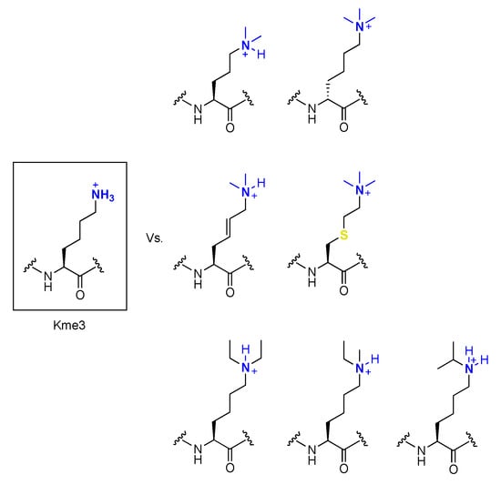 - Al Temimi, A.H.K.; Belle, R.; Kumar, K.; Poater, J.; Betlem, P.; Pieters, B.J.G.E.; Paton, R.S.; Bickelhaupt, F.M.; Mecinović, J. Recognition of shorter and longer trimethyllysine analogues by epigenetic reader proteins. Chem. Commun. 2018, 54, 2409–2412. [Google Scholar] [CrossRef]