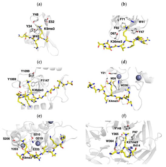 Ribbon representations of Kme3 readers (grey) in complex with histone 3 peptides (yellow) in stick representation. Key residues for Kme3 recognition are labeled and zinc ions are depicted as spheres. (a) HP1CD (PDB-ID: 1KNE) [138], (b) PHF1TD (PDB-ID: 4HCZ) [139], (c) BRPF1PWWP (PDB-ID: 2X4W) [140], (d) ING2PHD (PDB-ID: 2G6Q) [141], (e) ATRXADD (PDB-ID: 3QL9) [142], (f) EEDWD40 (PDB-ID: 3JZG) [143].