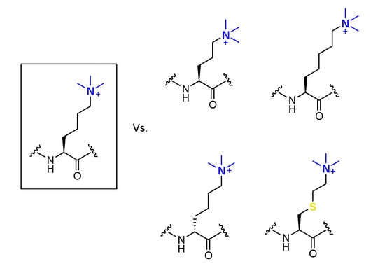 Trimethyllysine (Kme3 or TML) is characterized by a permanent positive charge due to the presence of a quaternary trimethylammonium group (Figure 1b). This broadly dispersed permanent charge makes it impossible for Kme3 to act as a hydrogen bond acceptor or donor while still being able to form salt bridges with Asp or Glu residues. The increased overall Van der Waals radius and the spatial demand necessary for cation–π interactions play a key role in specific recognition of Kme3 by biological effectors, sometimes referred as “readers”. For this reason, the trimethylammonium moiety is considered as a partially hydrophobic cloud that carries an evenly distributed formal charge of +1 [8,9,10]. Kme3-containing histones are marks for transcriptional activation and repression in eukaryotes, depending on the chromosomal context. Kme3, and other histone PTMs, act as molecular beacons for recruitment of effector/reader modules to the histones and DNA, which determine the downstream outcome of the modification and its effects on gene expression of the cell [25]. Reader motifs specific for lysine’s methylation states can recognize amino acid residues within the context of an amino acid sequence with a high degree of affinity and specificity towards their corresponding ligands. These reader domains induce selectivity towards their substrates with binding pockets that contain conserved amino acid residues with charged, hydrophilic, hydrophobic, or aromatic characteristics to attract or repulse certain PTMs [25,26]. Upon binding, various biological effects can be induced dependent on cellular context and reader protein [26].
