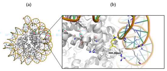 - Lu, X.; Simon, M.D.; Chodaparambil, J.V.; Hansen, J.C.; Shokat, K.M.; Luger, K. The effect of H3K79 dimethylation and H4K20 trimethylation on nucleosome and chromatin structure. Nat. Struct. Mol. Biol. 2008, 15, 1122–1124. [Google Scholar] [CrossRef] [PubMed]