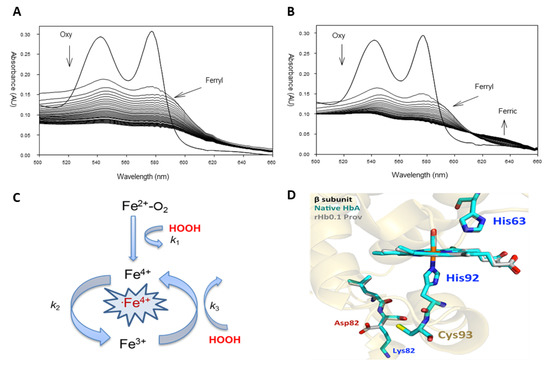Pseudoperoxidase activity of hemoglobin Providence. (A) Spectral changes in wild-type hemoglobin A (β82K) (arrows pointing downward indicate the direction of the reaction and the conversion of the oxy/ferrous (two main peaks; 541 and 577 nm) to ferryl heme (two main peaks; 545 and 580 nm)). (B) Hemoglobin Providence (βK82D) during oxidation by hydrogen peroxide. (C) A model represents the pseudoperoxidase activity of hemoglobin. (D) Comparison of the active sites, EF corner, F-helix, and C-terminus of β subunits in HbA (cyan, 2DN3) and rHb0.1/βK82D (rHb0.1 Prov) (gray, 5SW7). The drawing was made by MOL Molecular Graphics System, version 2.0 (Schrodinger, LLC) (New York, NY, USA). Panels A, B, and C were reprinted with permission from [14,17].