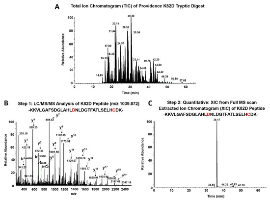 All quantitative experiments were performed in triplicates and the standard deviations were obtained by averaging relative abundance data from three different experiments. Extracted ion chromatograms (XICs) were generated from the most abundant monoisotopic peak of isotopic profiles representing the charged states of each peptide (oxidized and unoxidized). To construct XICs, the Xcalibur (version 2.4) software (Thermo Fisher Scientific, Waltham, MA, USA) was used with a designated mass tolerance of 0.01 Da, and mass precision was set to three decimals. For relative quantification, the ratio of each isoform was calculated based on the sum of the XIC peak area from all forms, which was normalized to 100% and included all charge states and versions that result from different cleavage sites (more details can be found in [17]).